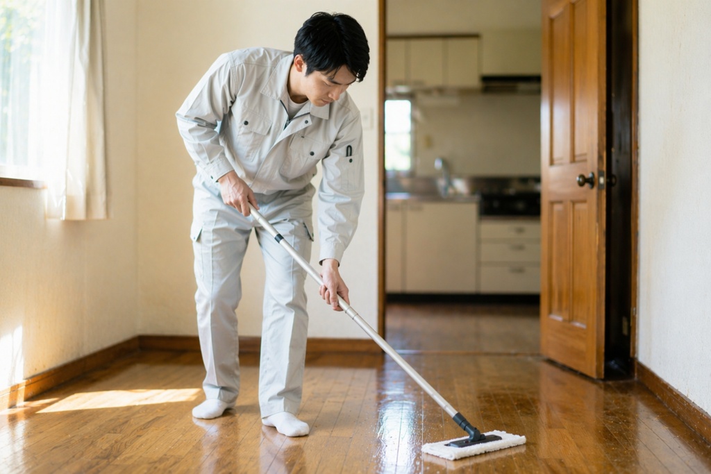 建物内の簡単な掃き掃除を行います。ほこりを払うクイックルワイパー※カビ等防止のため水吹きはいたしません。