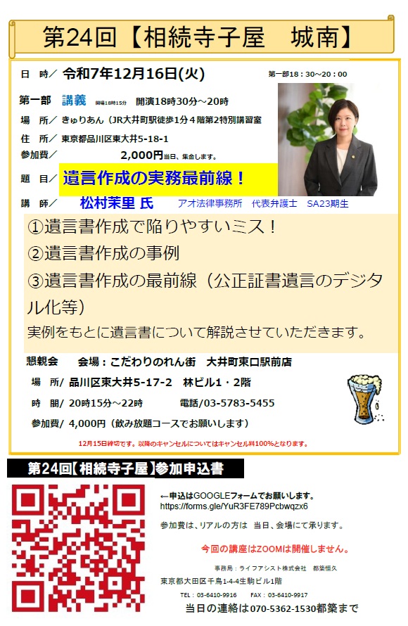 12月16日 品川区 にて相続寺子屋城南を開催しました。