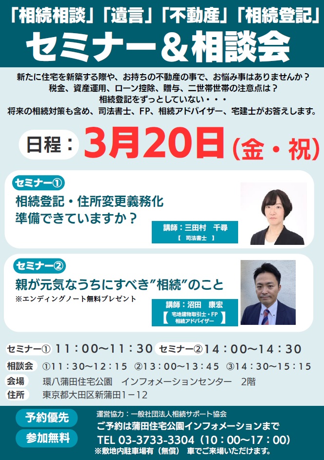 大田区蒲田3月20日 杉並区浜田山3月22日にて「相続」「遺言」「確定申告」「二世帯住宅」無料セミナー無料相談会を開催します。※駐車場あります。車での来場可能です。