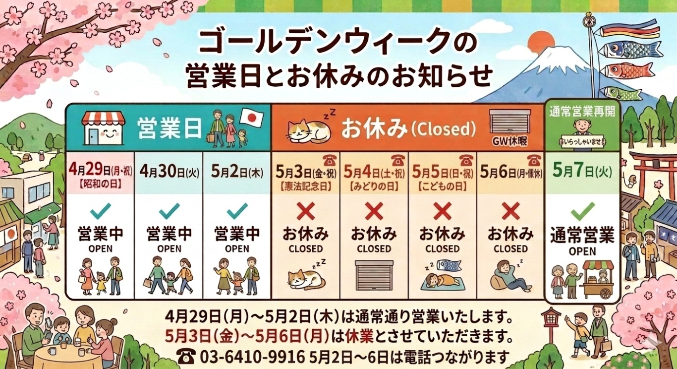 誠に勝手ながら、5月3日(金)~5月6日(月)の期間はGW休業とさせていただきます。